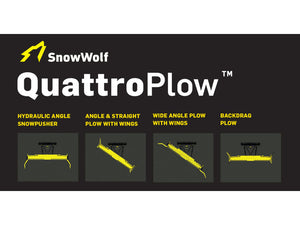 Este equipo innovador combina y mejora el ingenio de dos innovaciones anteriores de SnowWolf, FastTach® y WolfWings™. Los resultados son mayor flexibilidad, eficiencia y eficacia en cuatro funciones distintas, todo ello sin necesidad de arneses eléctricos ni controladores adicionales en su máquina. Cambie fácilmente de arado en ángulo a arado recto, de empuje de alta capacidad a arrastre hacia atrás en solo unos segundos sin tener que abandonar la máquina ni siquiera presionar un botón. Una quinta función, el arado de gran ángulo, extiende el arado 23 pulgadas en cada extremo. Basta menos de un minuto para reposicionar los cilindros de ala a cada lado del arado. Revolucione la forma de mover la nieve (y su negocio) en la dirección correcta.