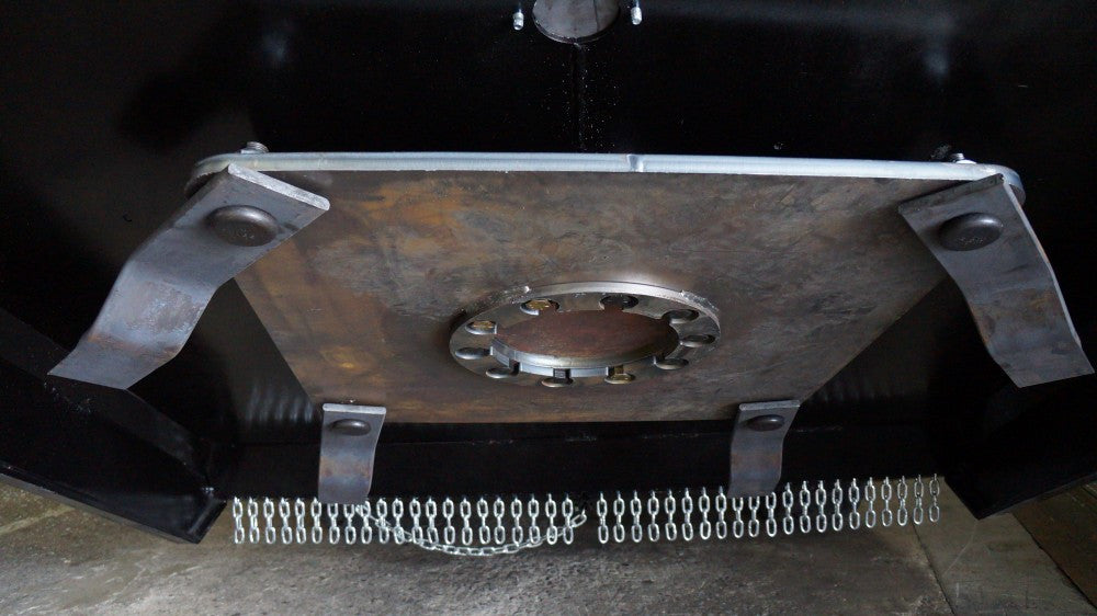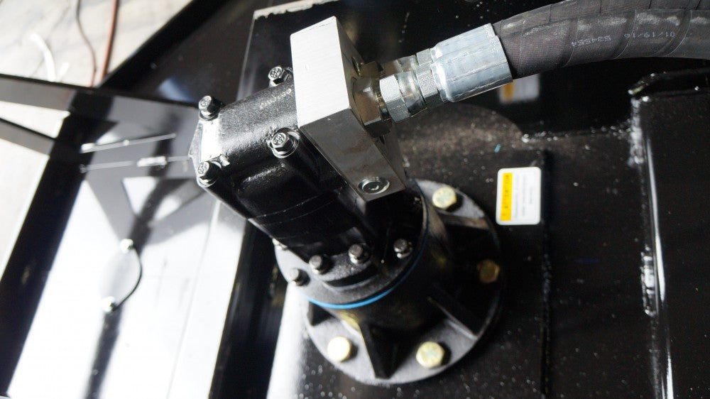 The extreme duty brush cutter is a high-powered, low flow or high flow direct drive unit with a 1-year warranty. The purpose built hydraulic motor drives a 3.5” forged one piece drive spindle! that is housed in 2 massive bearings. The direct drive bearing carrier is now grease packed and can be greased from a zerk under the hood. This new improvement has dramatically reduced down time and bearing failures! Under the deck, instead of a spline shaft, it has a 13” x 1” flange with 10 bolts connecting the blade carrier. The wire protection kit between the deck and the blade carrier keeps fence wire and vines away from the lower bearing seal and reduces down time from hidden debris. This powerful yet quiet cutter will produce a cleaner cut at a quicker travel speed than was thought possible on a low flow skid steer. The 10” deck clearance and the raised back allow cut debris to escape and to easily avoid bunching under the deck.