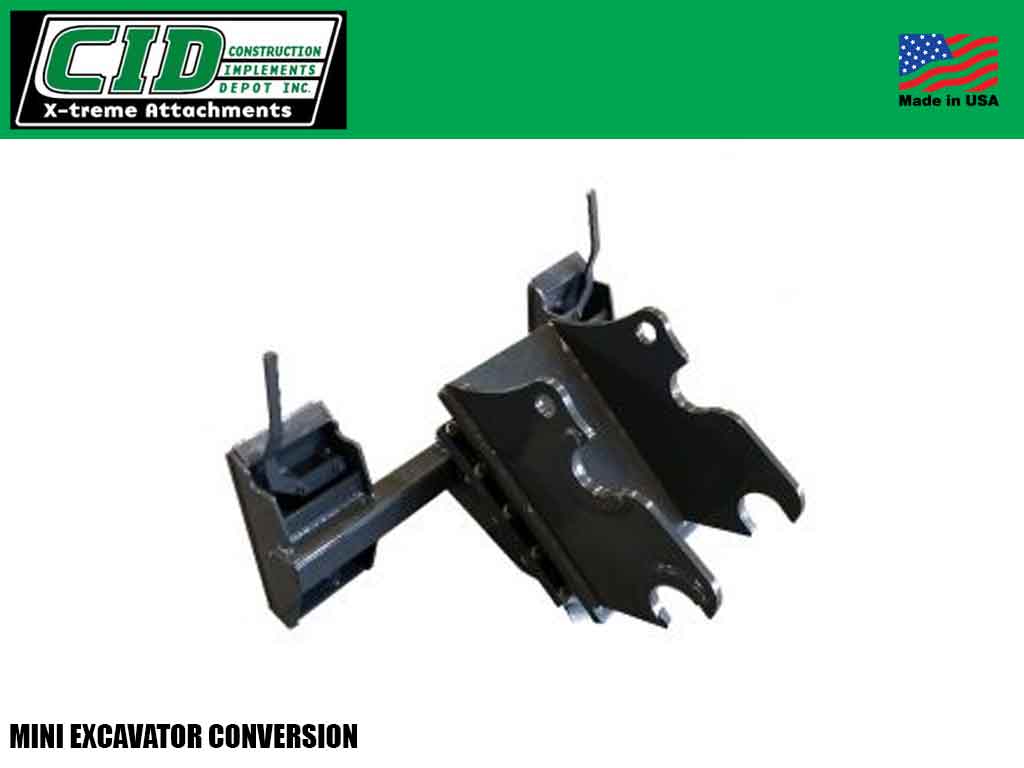 With the CID Mini-Excavator Conversion, your pin on or Quick Connect excavator can easily be converted to a skid steer quick attach. All we require are a few simple measurements. For those that have John Deere loaders or Euro loaders, we also make a conversion to attach to your loader which enables you to use skid steer attachments.