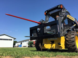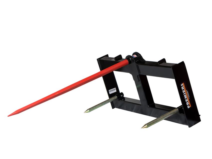 Two lower stabilizing spears, made out of zinc plated 1-3/4” solid steel, to prevent bale from rolling and swinging while being moved