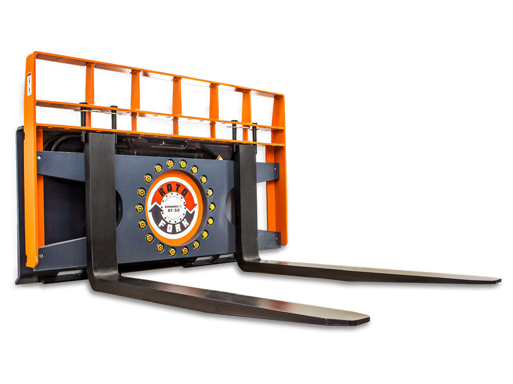 The Roto Fork RF-50 is a heavy duty rotating fork system that offers continuous bi-directional rotation with a 5,000 pound load capacity. The hydraulic worm drive slewing ring provides precision control and self locking positioning as well as a slim profile to maintain the load center close to the machine. Robust fork positioners allow multiple location choices with easy to use pin retainers. The low profile carriage rack grants high visibility and ease of access for the operator. Pair this with our Xtreme Duty Demolition Carts for efficient material handling. Great for demolition and landscaping applications!