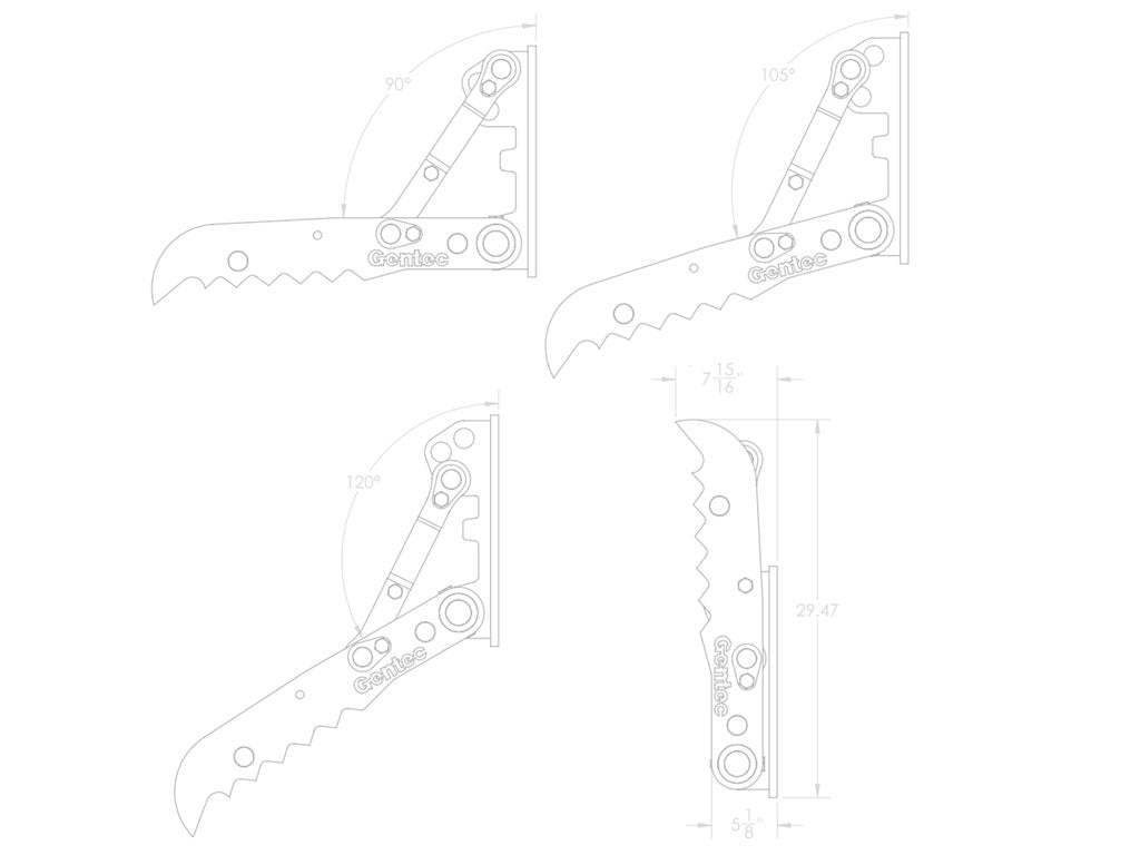 The MT830 features an unparalleled design that sets it apart from the competition. With three adjustable positions at 90, 105, and 120 degrees, you can customize your thumb for the perfect fit and optimal functionality. The 120-degree position offers greater flexibility and reach compared to other brands. When not in use, this compact thumb quickly stows away, taking up only 29.5" of vertical room on your excavator stick and extending just 7.5" off the stick when stowed, ensuring it won't get in your way when digging. With no loose parts when stowed, you can rest assured that your equipment is secure and ready for use whenever you need it.